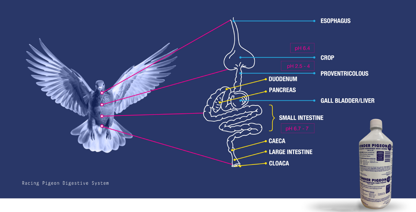 an acid with natural antibacterial activity (normally effective only in an acidic environment) and a fat molecule with extra feeding power. This link allows the acids to be effective against some bacteria in any environment, while the fat-glycerol is easily absorbed by the intestine. This provides both extra energy and strong recovery power to the pigeon. This is how it works. No secrets, just science. Only a small amount of product is needed on the food or in the water, making it one of the least expensive products on the market.